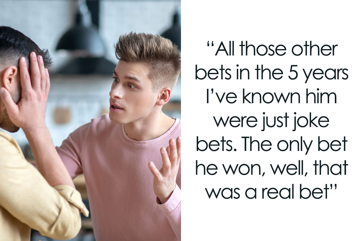 Load More Replies...In OP's response to the first reply above, asking why he went along with it and were they still in grade school, he replied "I've tried not taking the bet but then he'll just call me cowardly because I know he's right." So what? They're both childish. The friend for calling him a coward for not betting, and OP for caring what the friend said or thought.