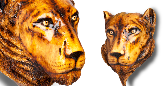My sculptures are made using chainsaws of varying types while finer details require the use of many other smaller tools. They are made by hand, never by computer design or machine process. The sculptures are burned to create contrast and detail, never painted or dyed. Finishing requires many layers of polyurethane varnish to preserve the piece and reduce cracking from moisture differentials. The finished product is made only of wood, varnish, and happiness.