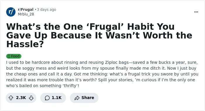 Even Reddit user Mrblu_28 is struggling with such a “hack,” so they asked netizens, “What’s the one ‘frugal’ habit you gave up because it wasn’t worth the hassle?” They soon found out they’re not the only ones, as folks spilled out many such things they've experienced. Just scroll down to check them out, as you might find them relatable!