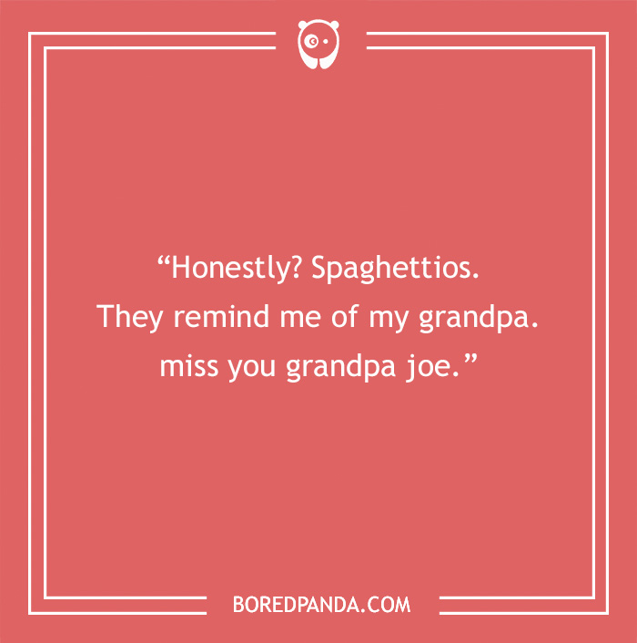 "Honestly? Spaghettios. They remind me of my grandpa. miss you grandpa joe."