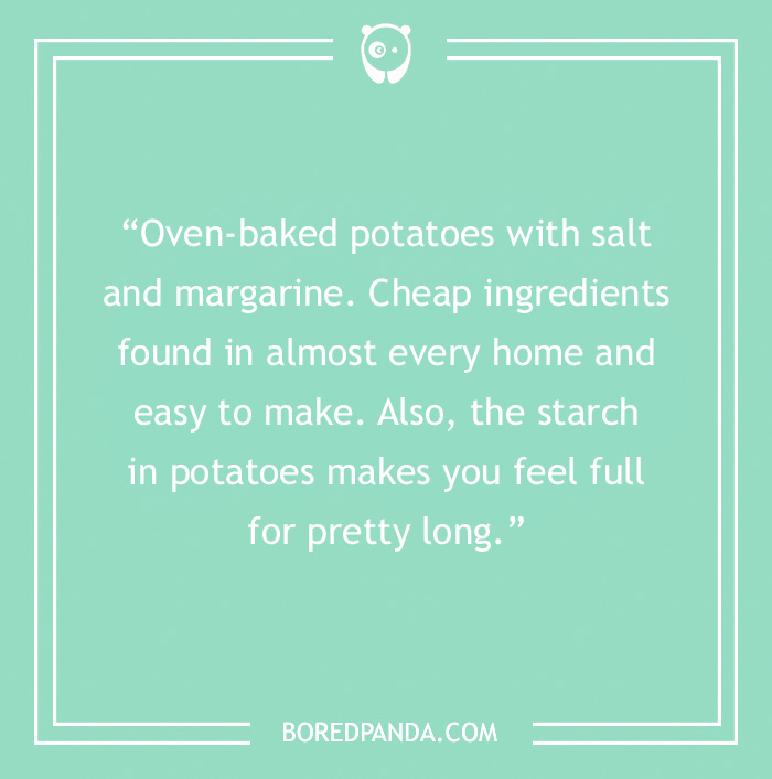 "Oven-baked potatoes with salt and margarine. Cheap ingredients found in almost every home and easy to make. Also, the starch in potatoes makes you feel full for pretty long."