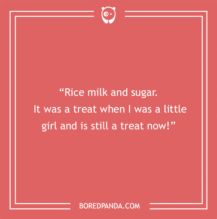"Rice milk and sugar. It was a treat when I was a little girl and is still a treat now!"