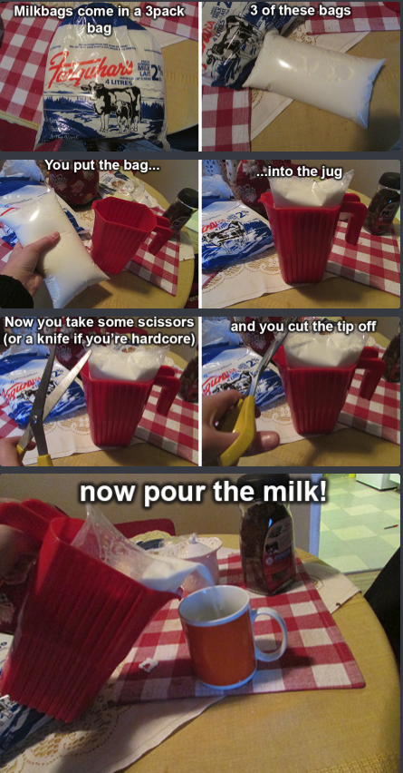 Serious question from the EU where you get milk in tetra-paks or glass bottles: Does milk in bags stand in the fridge while open? Or do you have to fill it in a bottle once opened? Edit: Thanks for all the answers. I was really curious.