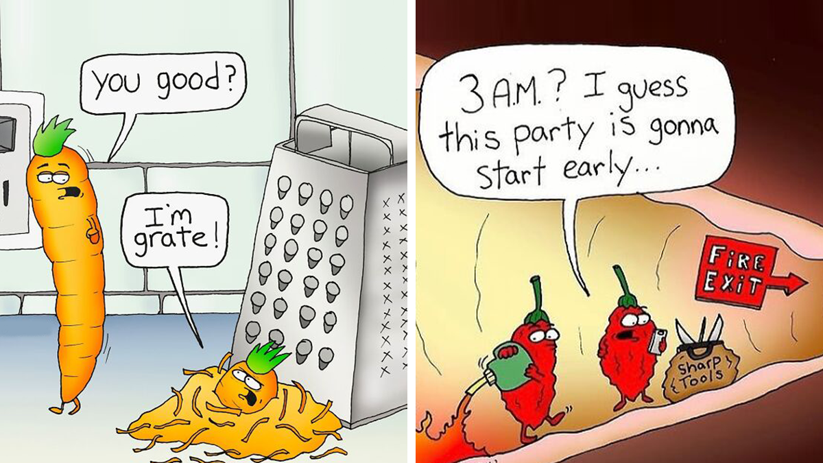 King draws each comic by hand using pencil and ink before adding digital color, often with help from his wife. The series has built a cult following on Instagram under @fruitgonebad and has been featured multiple times here on Bored Panda. Known for its recurring characters, such as overripe bananas and sassy kitchen items, the comic keeps its tone lighthearted and non-political while leaning into playful absurdity.