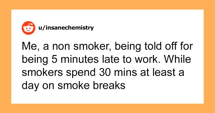 Me, a non smoker, being told off for being 5 minutes late to work. While smokers spend 30 mins at least a day on smoke breaks.