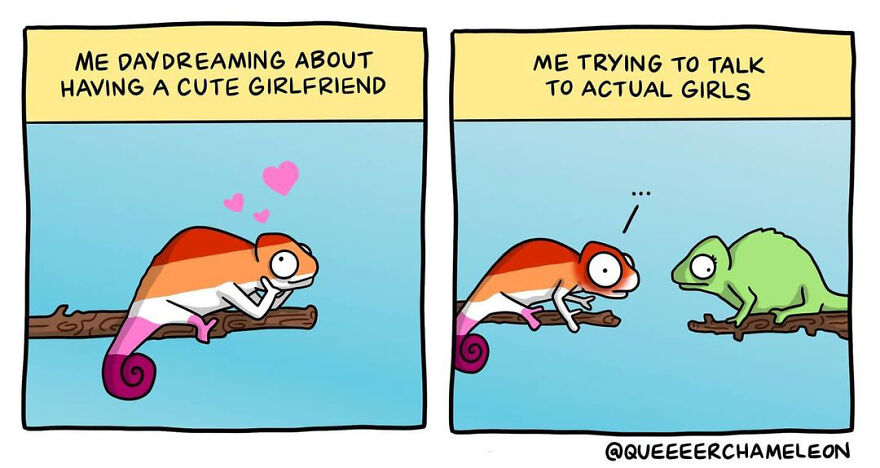 Not only are human beings rejected or misunderstood because of their otherness, but apparently chameleons as well. Today Bored Panda wants to share wholesome comics created by Amee Wilson. Being queer herself, she felt the need to represent LGBTQ+ people and that's how she came up with "Queer Chameleon". The artist takes stereotypes about queer people and turns them into funny illustrations that might make you feel stronger in drawing your own lines.