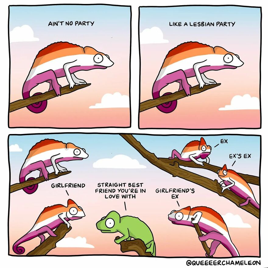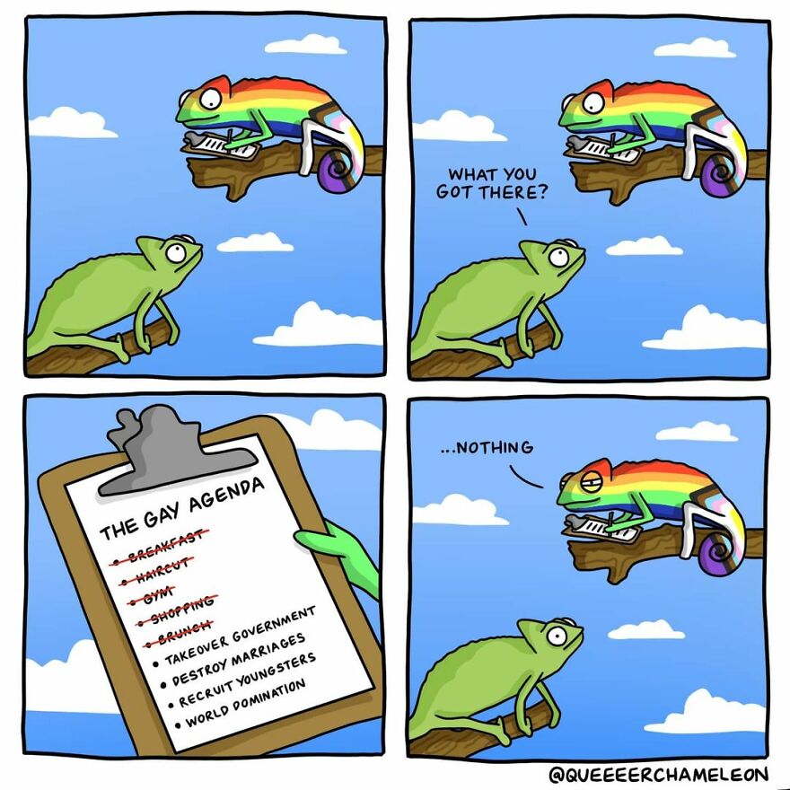 Not only are human beings rejected or misunderstood because of their otherness, but apparently chameleons as well. Today Bored Panda wants to share wholesome comics created by Amee Wilson. Being queer herself, she felt the need to represent LGBTQ+ people and that's how she came up with "Queer Chameleon". The artist takes stereotypes about queer people and turns them into funny illustrations that might make you feel stronger in drawing your own lines.