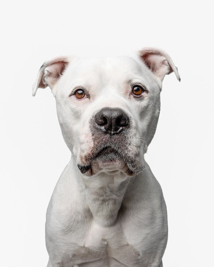 Isaiah, the rescued Pittie mix. I love capturing white dogs on white backgrounds. The details of their faces pop, especially the eyes and nose!