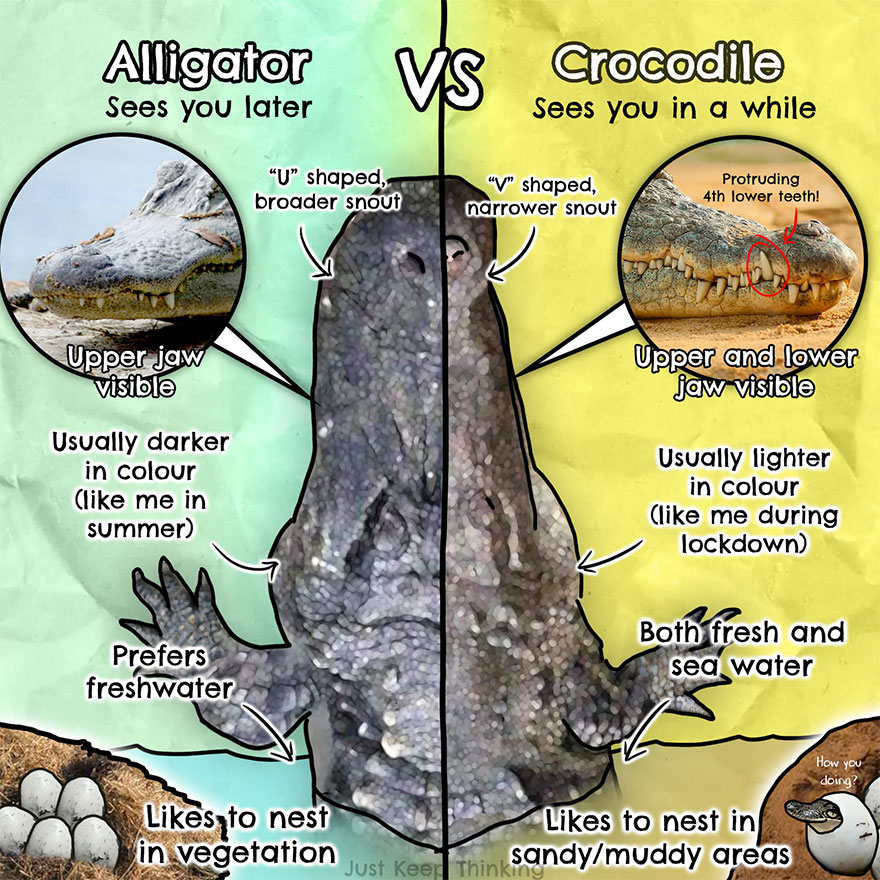 Another way to tell is that alligators only exist in North America and China so if your not in either of those places it is not an alligator.