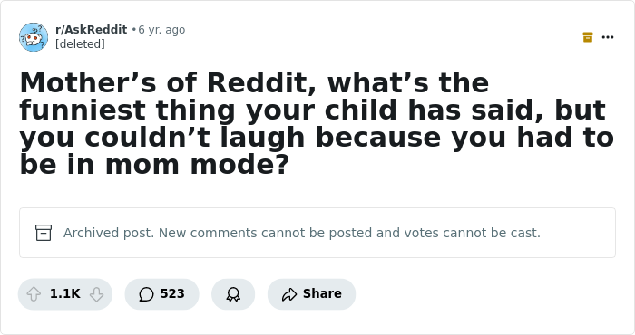 Not a mom, but one time I ran inside, crying, sobbing, the whole shebang. I then say, “brother called me a tattle-tail!” She then had to explain that the reason I was a tattle-tail was because I told her about everything, while trying not to laugh at me.