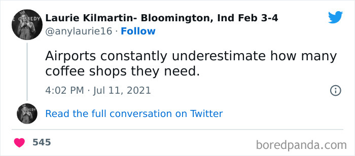 Usually, something relatable to us has funny written on it. Relatable tweets about airports talk about the waiting line near the ticket master, the food on the planes, or the cost of everything there. These hilarious tweets can come from anyone, even from celebrities. With travel being so accessible and easy to do, we all have to suffer through the annoyance of airports, thus making it universally funny.