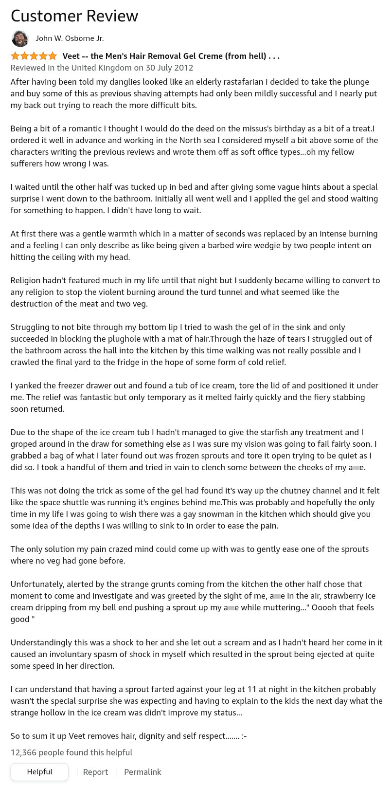 If you think this is funny, you need to read the following review about Veet for men. OMG!!! https://www.amazon.co.uk/gp/profile/amzn1.account.AFW3VVWFNEERJW5UF5Y6FQ3HPBTQ/ref=cm_cr_srp_d_gw_btm?ie=UTF8