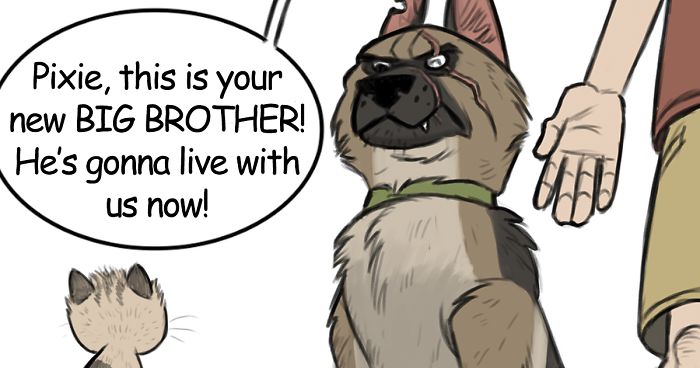 “Honestly, Pixie and Brutus were just another random comic idea I had while at work. I was never planning on making them a series; I just thought it would be a funny idea to introduce a cute little kitten to a big intimidating war dog. So I made the first Pixie and Brutus cute animal comic, and people liked it so much I just kept making them.”