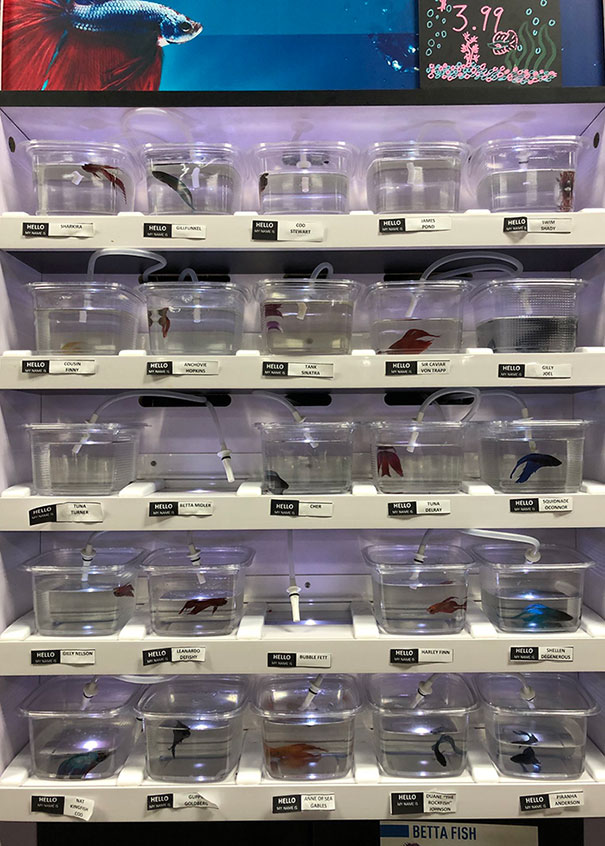 Not only these fish puns are absolutely hilarious, but they also might relieve you from the stress of picking your new pets' name. Twitter user criminalcal shared a photo she snapped at an unknown pet store which has funny names of all their betta fishes picked out. And the funny puns are absolutely hilarious! If you ever buy one of these fish, you definitely won't be needing to change them. Scroll below to see the name puns and upvote your favorites!