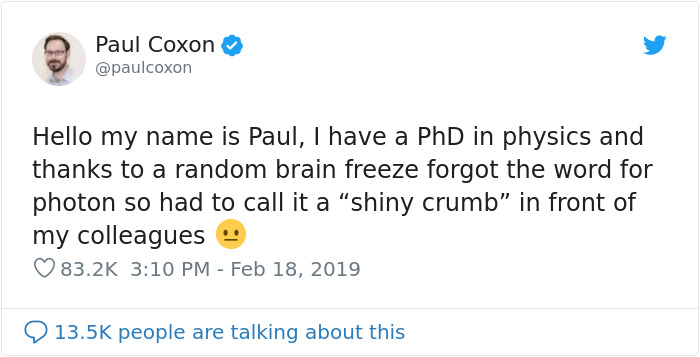 We've all been there. You're in the middle of a conversation or a presentation and suddenly your mind goes blank. What was that basic word, the one that I really really should know? Your panicked reaction to this untimely brain freeze only makes things worse, as your mind desperately scrabbles for an alternative word meaning something similar. Any alternative. "Shiny crumb," was what University of Cambridge physicist Paul Coxon eventually blurted out, having inconveniently slipped over the word "photon," a term that he would otherwise casually refer to several times a day. Naturally, his fellow scientists found it hilarious that Paul, with a Ph.D. in physics, was capable of such a catastrophic brain fart. It happens to the best of us! Paul took to Twitter to share his funny mistake and found that he certainly isn't alone who's sometimes having trouble with English words!