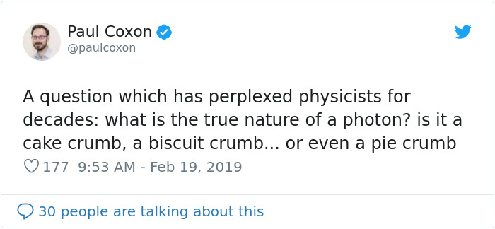 "I was talking with a colleague about how we can control the routes photons, i.e., particles of light, can take as they pass through the various solar photovoltaic materials and my mind just went blank," Paul explained to Bored Panda. "We were in the department tea room and there were crumbs on the table so I guess my mind just jumped and switched photons - a word I must say dozens of times a day, for “shiny… crumbs”. I can’t properly describe it. We both saw the funny side."