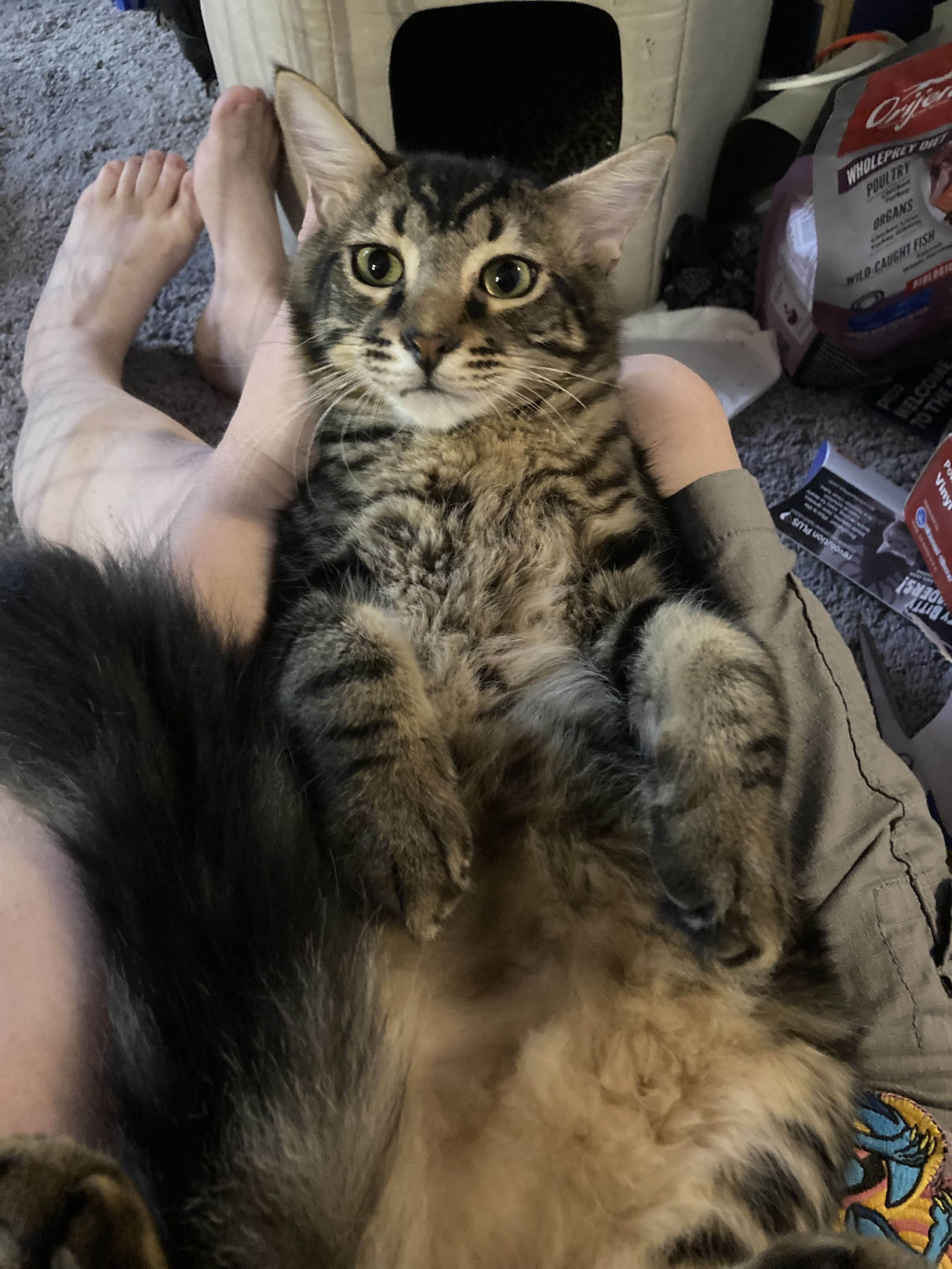 "Recently, my cat Luke likes to be on my lap at night. Not just resting on my lap. He likes to sprawl out on me, so I end up holding him like a baby with my arms stretched out supporting him while he gazes up at me and falls asleep. I'm unable to move my arms at that point, or I'll disturb his rest. It's ridiculous and adorable at the same time. This is not only comfortable for him, but it's also our daily bonding moment outside of playtime and mealtime."