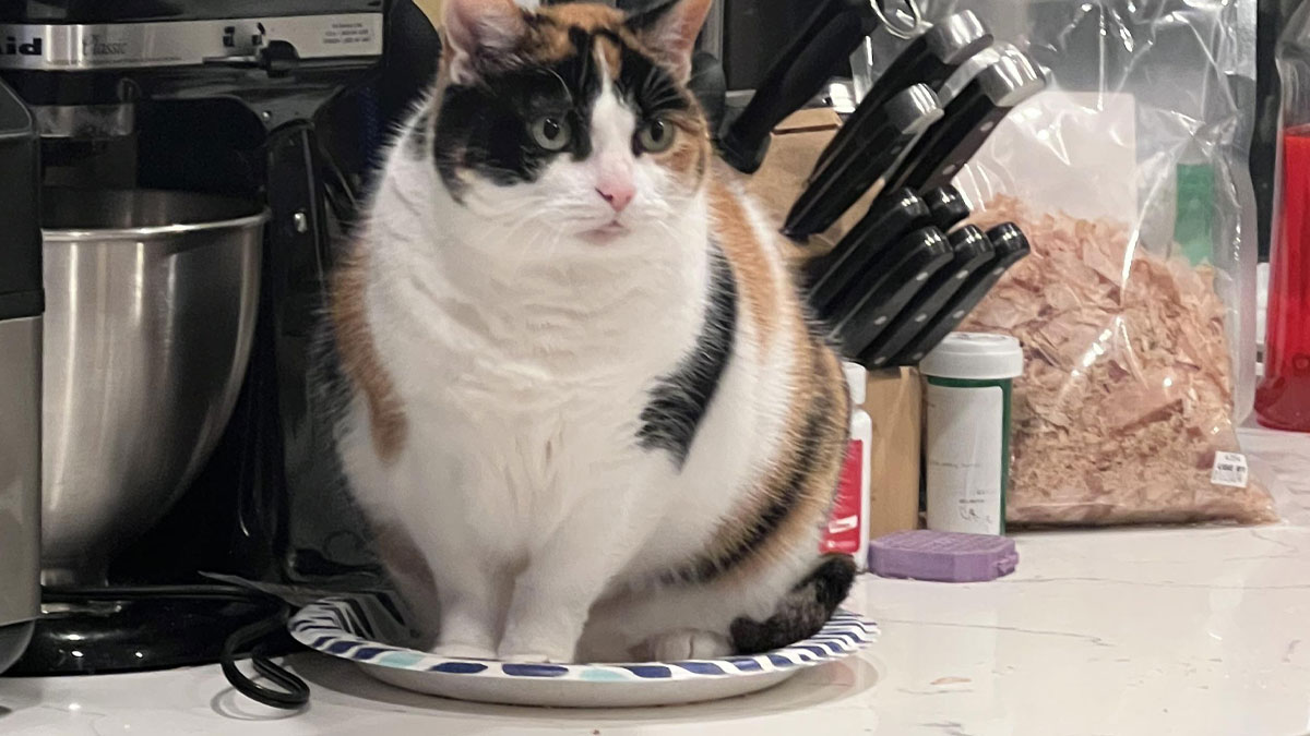 Calico cat sitting on a plate on a kitchen counter, a classic funny cat trap moment.
