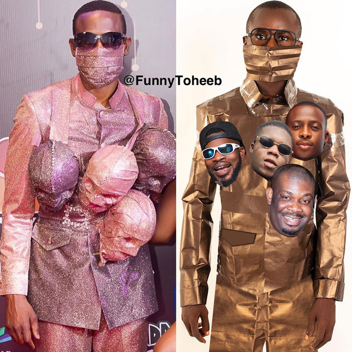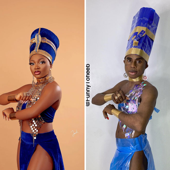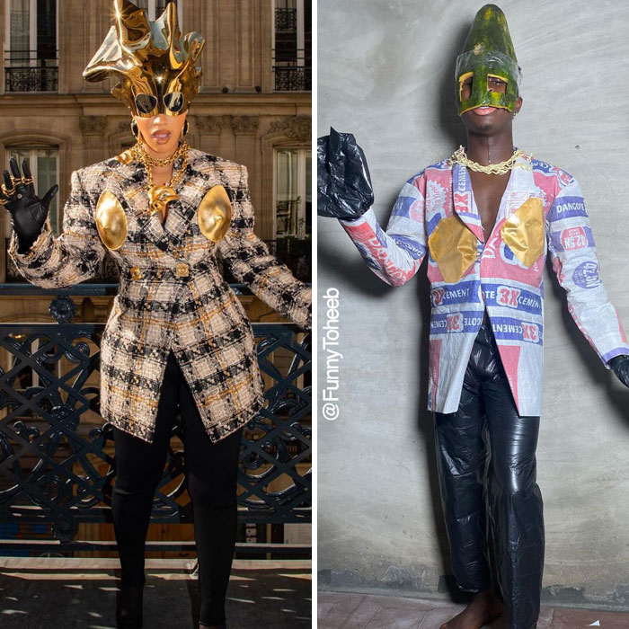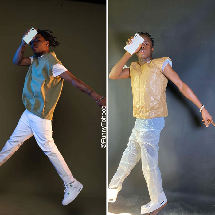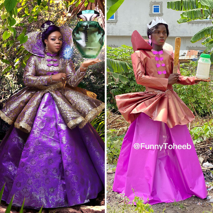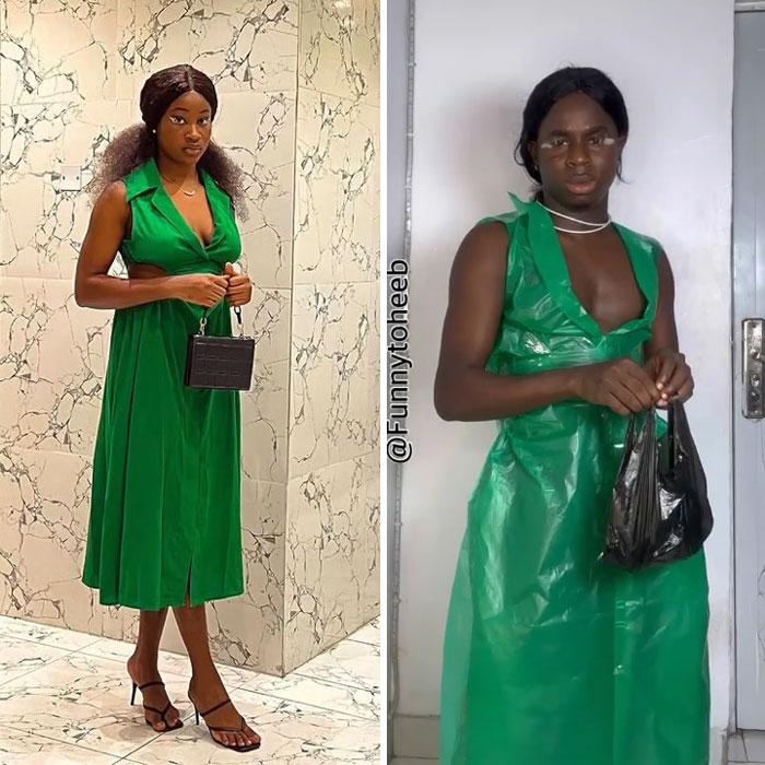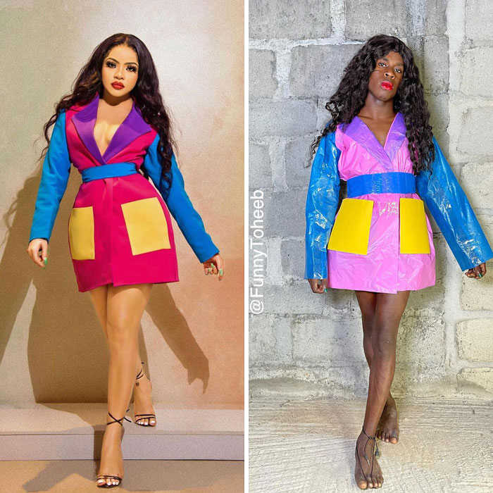 Actor, comedian, model, and influencer Funny Toheeb, from Nigeria, impersonates celebrities and recreates their looks using cheap materials. He gently pokes fun at the super strange clothes that stars sometimes wear to major events. It’s all done for the sake of fun, and we hope it’ll brighten up your day, Pandas. Scroll down, upvote your fave pics, and let us know which of these looks you loved the most!