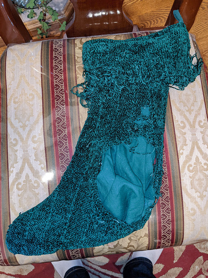 My Parents' Foster Dog Got To My Stocking That I've Had For 27 Years. Happy Holidays To Me
