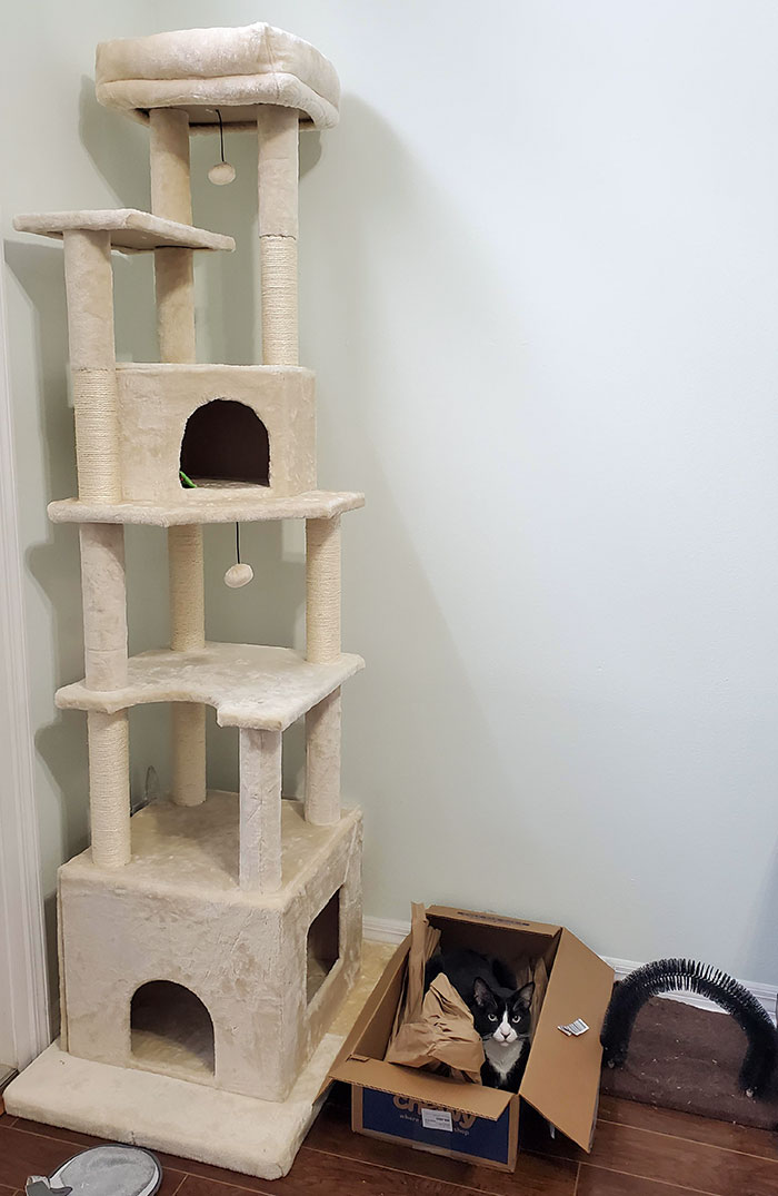 The $70, 7ft Cat Post You Bought Him For Christmas vs. The Box His Food Comes In