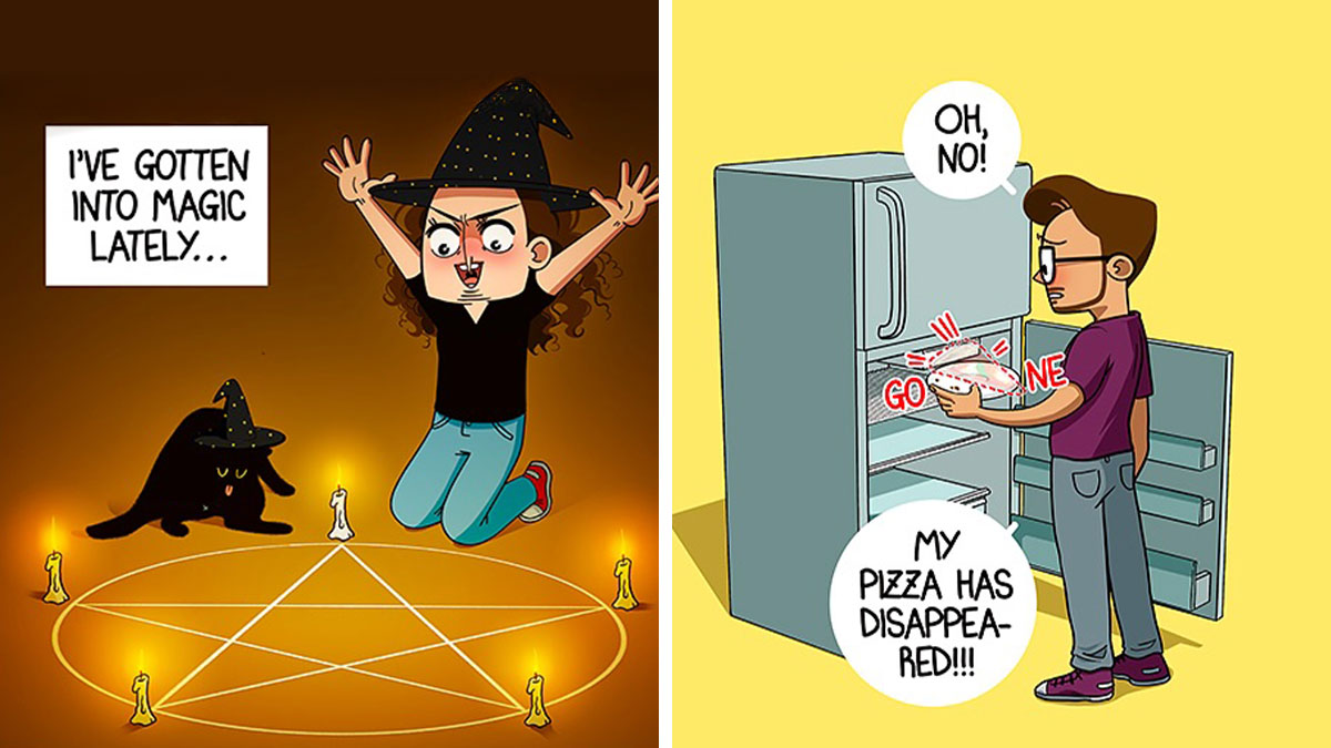 Comic strip illustrating funny everyday life and relationship moments with a woman, man, pizza, and wine in a cozy setting.