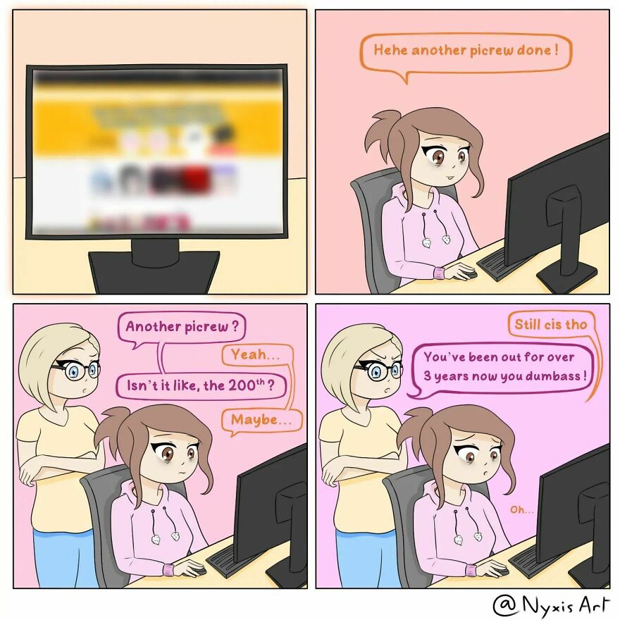 Through her Instagram platform, she often shares her personal journey and artistic reflections, engaging over 2K followers. Her comics delve into themes like identity exploration, the nuances of transitioning, and everyday challenges, resonating deeply with those following her.