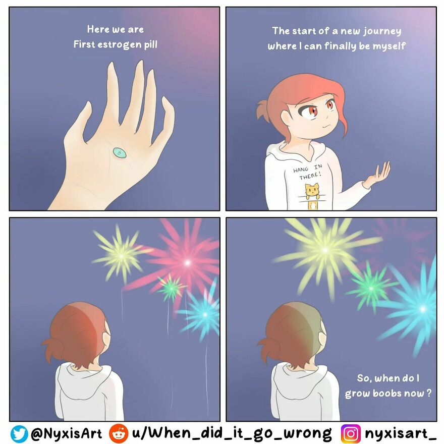 From experimenting with names to adapting fashion choices, Nyxis' work is not just entertaining but enlightening, offering a unique perspective on the highs and lows of womanhood and transition.