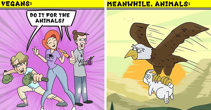 Bored Panda got in touch with the artist, who clarified the themes that he covers in these comical scenarios: "The theme: satirical humor, philosophical humor, and a bit of slice of life-style humor revolving around two bears (father and son) and a ton of other animals attempting to adapt to a fast-changing human world. Most of the animals can be seen as an allegory for the struggling lower-class society in our world. I express this in the form of short funnies, and at other times, I explore more lore for each character. But there's always humor involved. (After all, laughter is the best medicine, right?) Anyway, the biggest inspiration for this was the book titled 'Animal Farm' by George Orwell."
