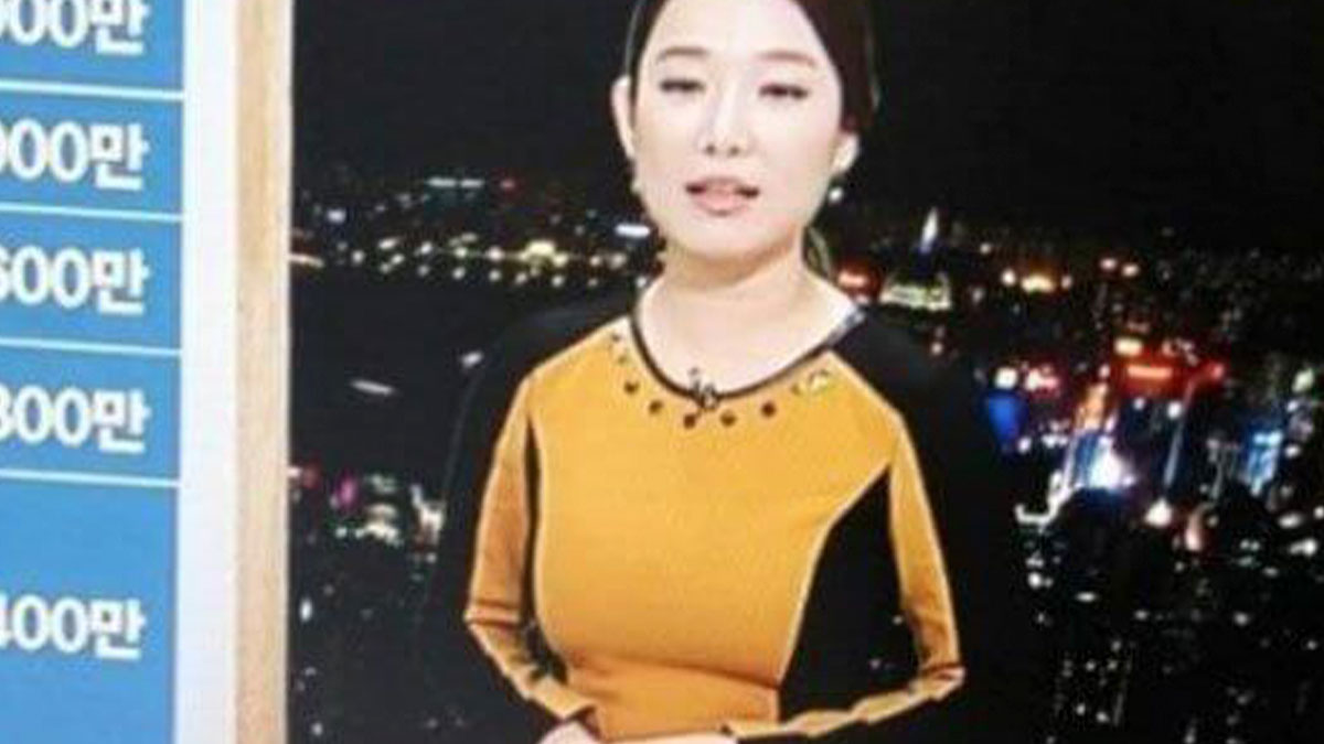 News anchor blending into background city lights due to dress colors, creating a blursed visual effect in broadcast.