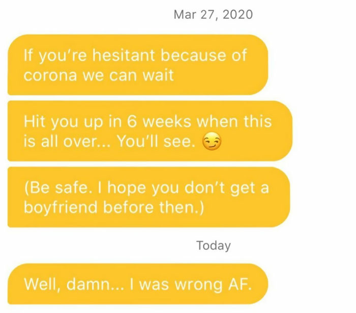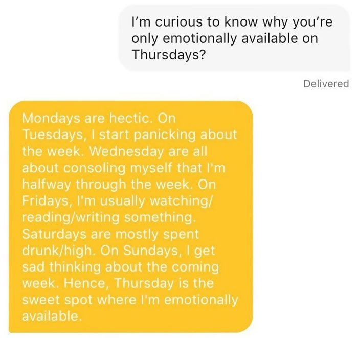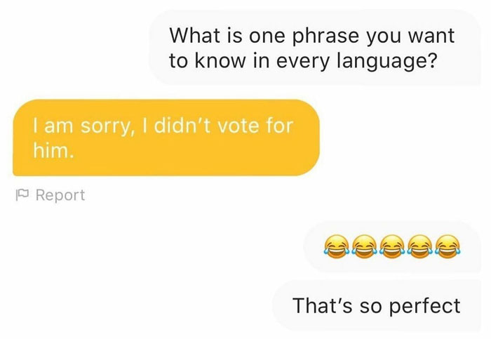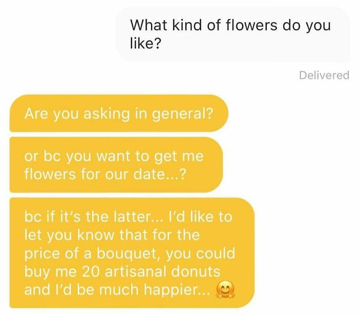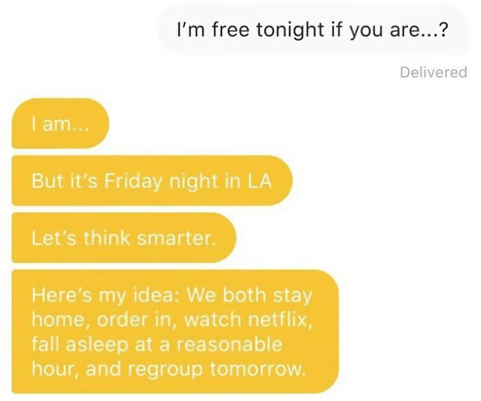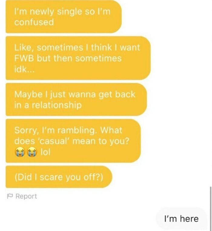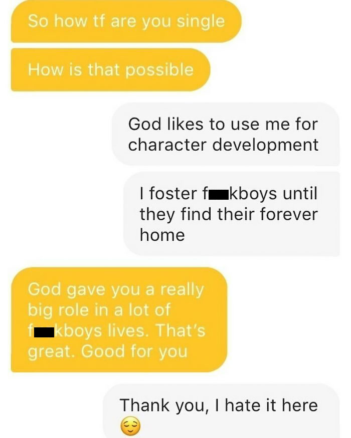 you have never used a dating app have you? These aren't overhearing conversations. These are actual text conversations from a dating app. These are the kind replies. Bleh to you.