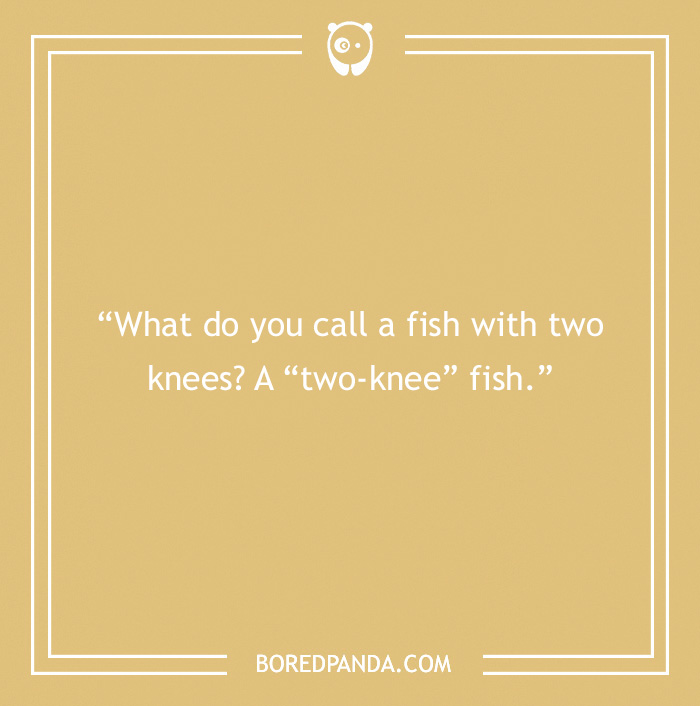 A dad joke on a yellow background: "What do you call a fish with two knees? A 'two-knee' fish." What do you call a fish with two knees? A “two-knee” fish.