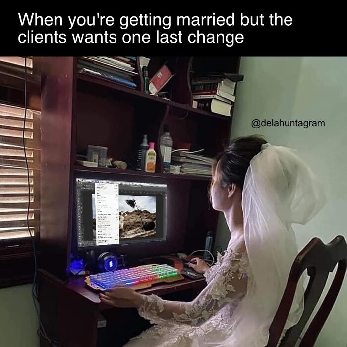 Graphic designer in wedding dress edits project at computer, caption humorously reflects designer's work-life balance challenges.