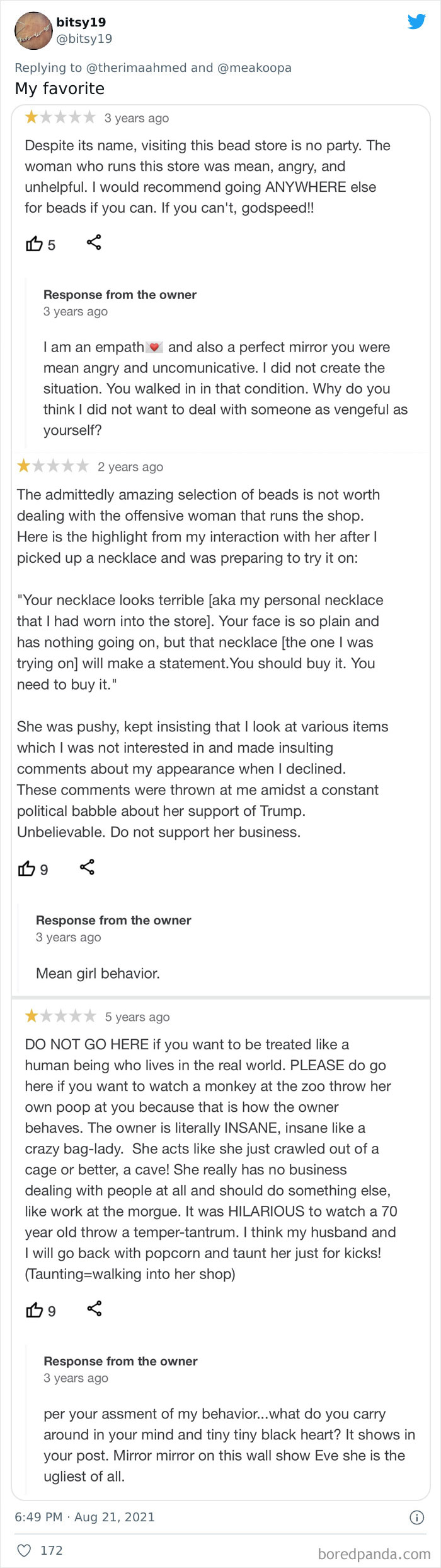 But we can’t help but enjoy when reviews or their responses kick up some drama though. It must be difficult to remain professional as an owner when some reviews are just begging to be ripped on. Again, think about what you want to say before you leave a review or respond to one. After all, you might just end up on a Bored Panda article.