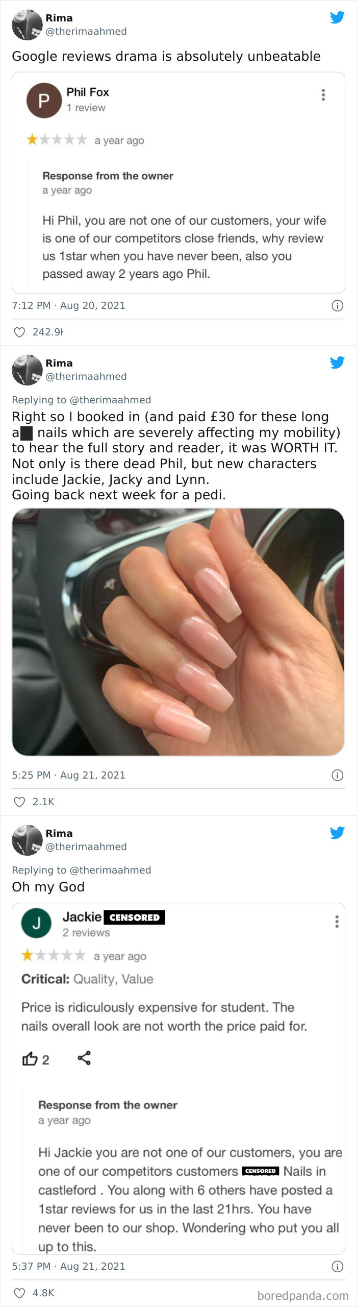 In a viral tweet, @therimaahmed highlighted some of the best examples of review drama found online. There are restaurant reviews that don’t even talk about the food, absurd facts shared by visitors, and plenty of feisty replies to boot as well. Check them out below and rate the best ones.