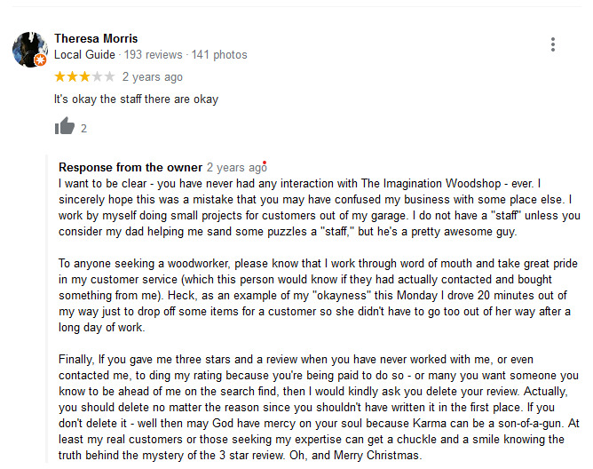 In fact, if you dive deeper, you’ll find all sorts of bizarre and ridiculous reasons for both great and terrible feedback. And some business owners even go as far as fighting back against their naysayers, resulting in some unprofessional but hilarious responses.