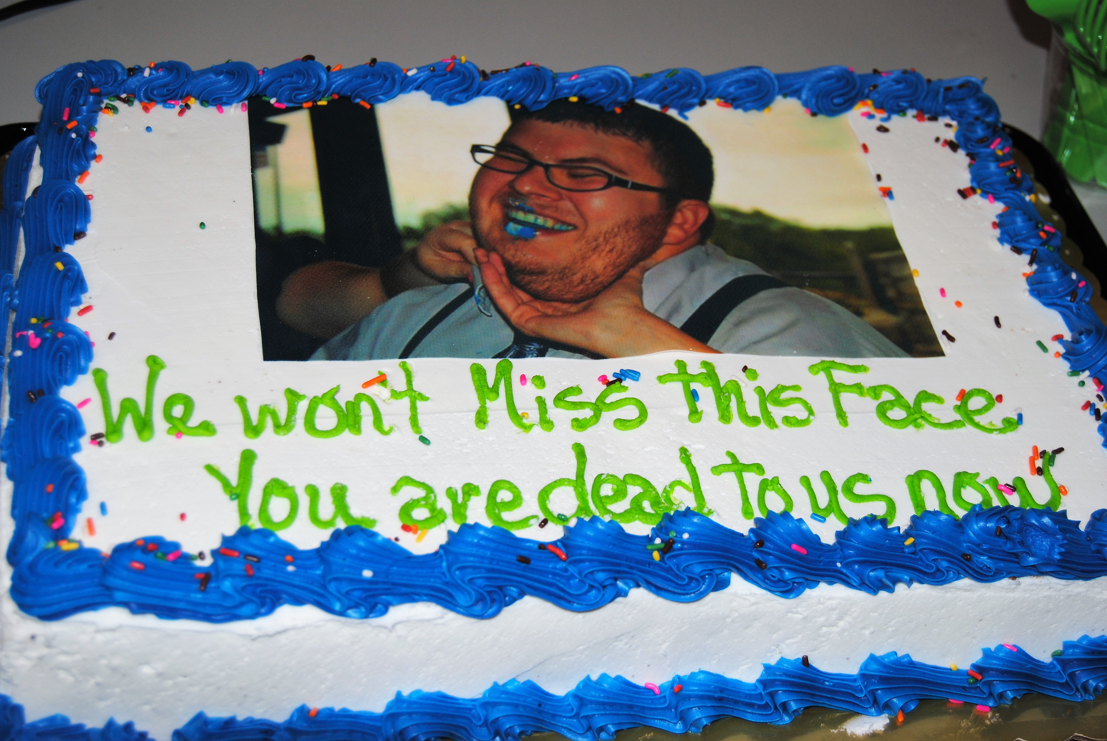 You mean to tell me that there wasn't a single person that pointed out the "your" oversight? You saw it fit to create a cake to honor them leaving, but couldn't find someone with at least an eighth grade education to crudely ice-on that last minute quip? Congratulations on getting the hell out of there! lol