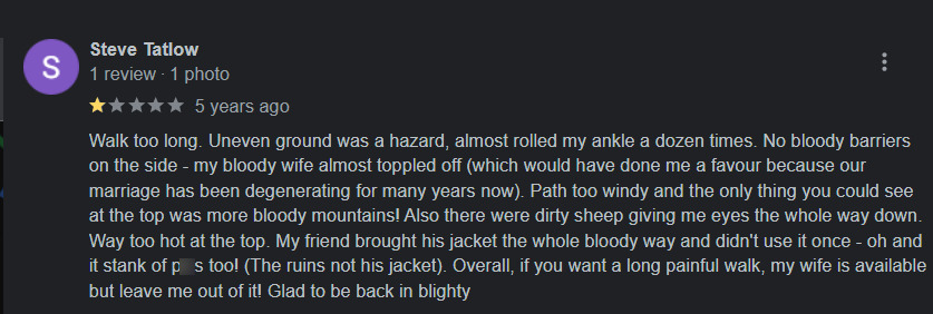 Most any outdoor attraction reviews are hilarious. Try Yellowstone in the US. I spent hours laughing.