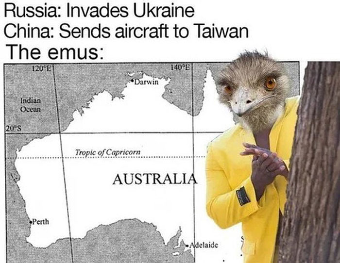 Let's not forget, The Great Emu War. It took place from November 1932 – 10 December 1932. Where Australia went to war with emus, and LOST!