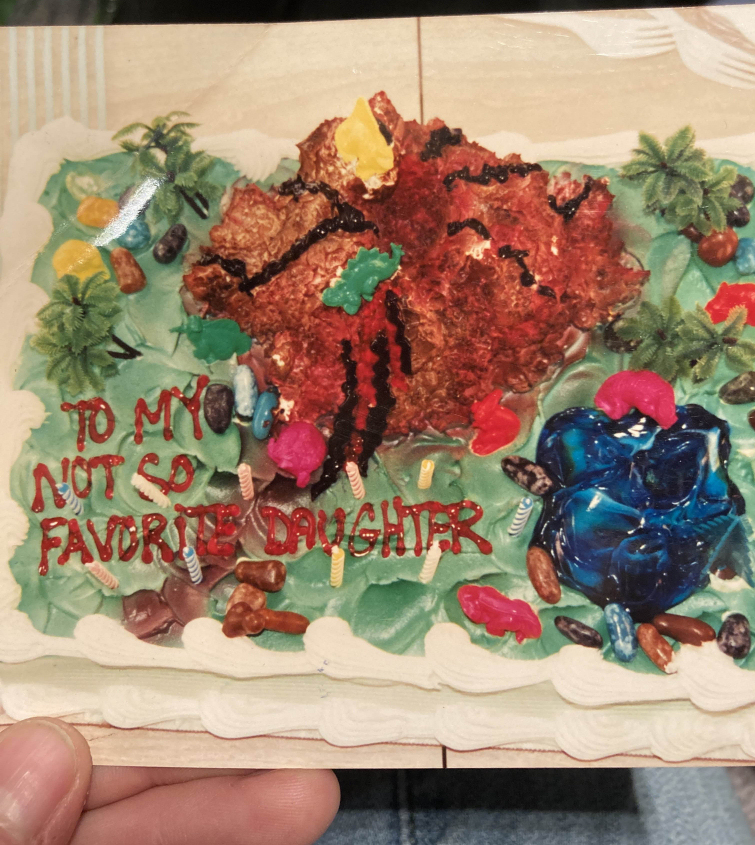 It's not funny, but I suppose it's "honest"... attached to this comment I'll post a photo of the birthday cake my mom got for my 8th birthday. Yes, it reads "To My Not So Favorite Daughter". I'm adopted, and I started crying when I saw the cake, because my older sister is my parents' bio child and is 100% my mom's golden child. My mom tried to explain that the message on the cake was "a joke". My dad was livid (he didn't know what she'd had written on the cake.) My mom then tried to say "But it has dinosaurs, you love dinosaurs!" I'll be 44 next month and I am STILL not over the hurt that cake caused me when I was 8 years old XD