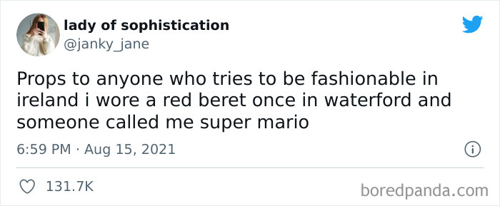 But according to this hilarious Twitter thread, you wouldn’t pass looking like this in Ireland. “Props to anyone who tries to be fashionable in Ireland. I wore a red beret once in Waterford and someone called me super Mario,” tweeted an author who goes by the handle @janky_jane.