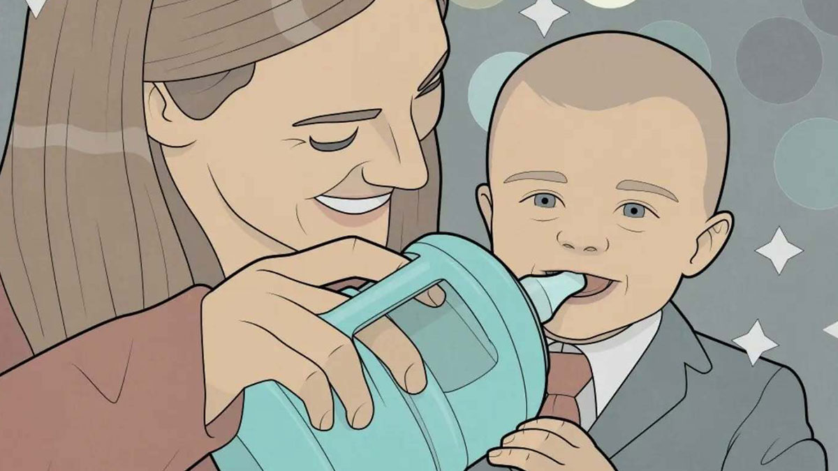 Comic illustrating social commentary: adult in business attire drinking from a bottle, blending adult and child roles humorously.