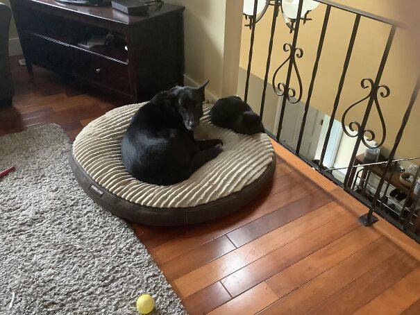 My Dog Got Way Too Jealous When I Was Cuddling With My Cat. Walked Over, Nudged Him Off Me, Then Just Laid On Top Of Him