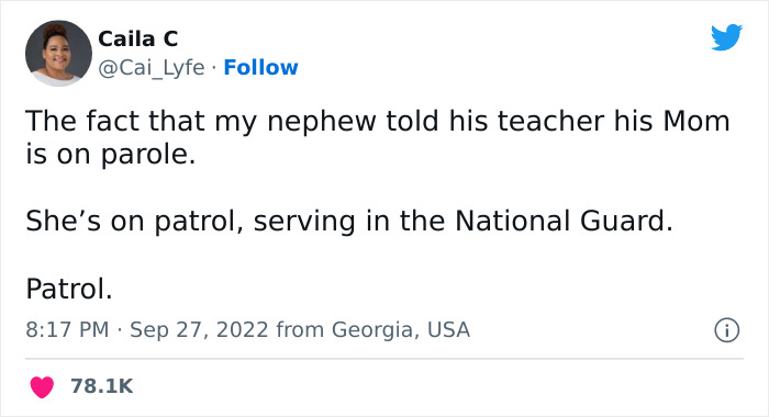 "The fact that my nephew told his teacher his mom is on parole. She's on patrol, serving in the National Guard," Caila C (@Cai_Lyfe) recently tweeted. "Patrol."