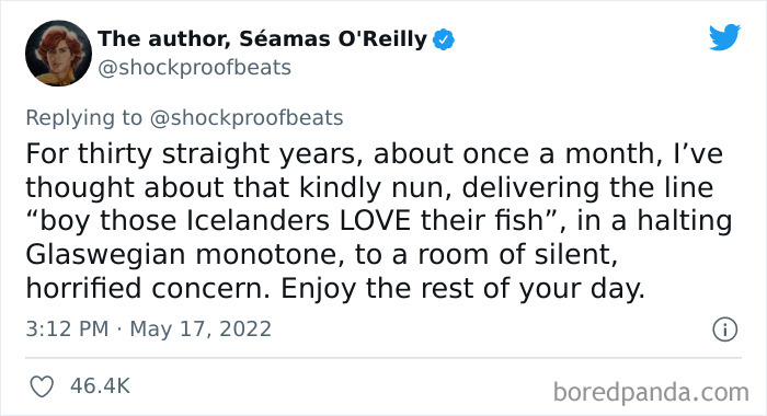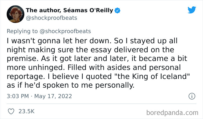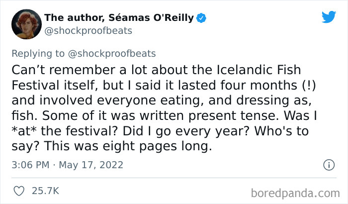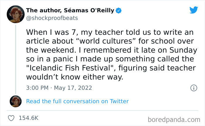 If you have ever been caught red-handed in a lie, you know how severely embarrassing it can be. Whether it was an innocent fib or full-blown deceit, your mind inevitably starts racing, thinking of all the ways to save your reputation. Luckily for us, though, these stories are hilariously entertaining. Recently, author and columnist Séamas O'Reilly posted a tweet about an elaborate childhood lie that involves a school essay, an "Icelandic Fish Festival" and the King honoring him by his presence and chatting with him directly.