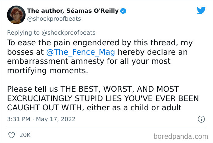 As if the tale is not wild enough, he then asked his followers to share "the best, worst, and most excruciatingly stupid lies" they've ever been busted with — and boy, did they deliver! Thousands of people rolled up their sleeves and typed out the mortifying moments that turned out to be so ridiculous and amusing, that it almost pardons them of their wrongdoings.