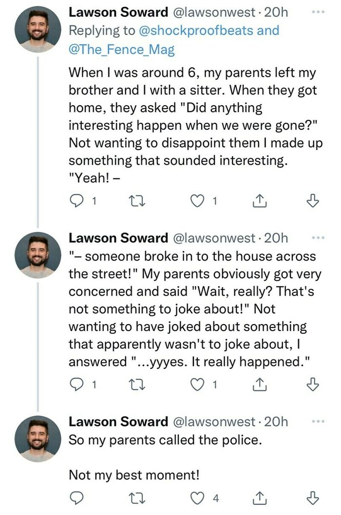 As if the tale is not wild enough, he then asked his followers to share "the best, worst, and most excruciatingly stupid lies" they've ever been busted with — and boy, did they deliver! Thousands of people rolled up their sleeves and typed out the mortifying moments that turned out to be so ridiculous and amusing, that it almost pardons them of their wrongdoings.