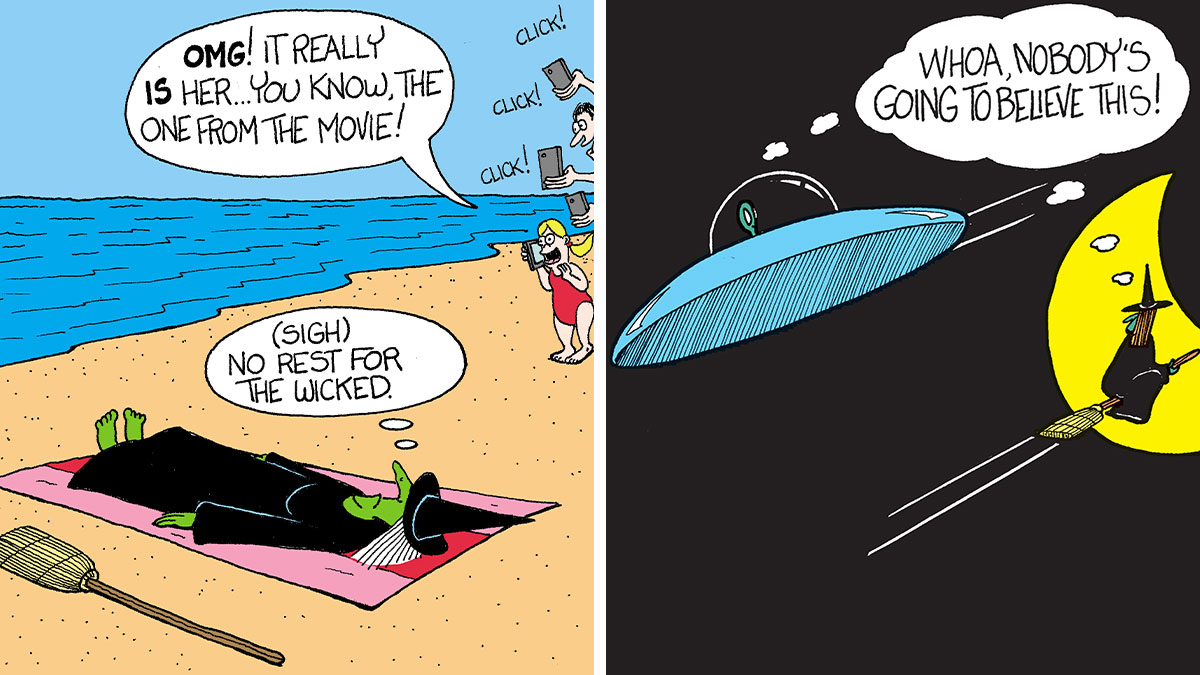 Inspired by popular stories like ‘Wicked’ and ‘The Wizard of Oz,’ Leigh Rubin has created hilarious strips that blend absurdity and humor with these iconic tales in a clever and entertaining way. Scroll down to see the amusing situations the artist has placed these famous characters in.