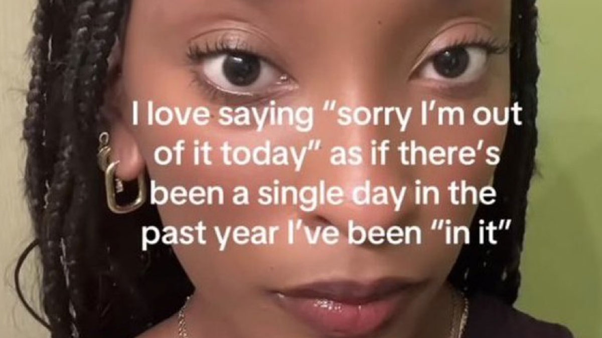 A woman with braided hair sharing a funny May tweet about saying sorry and feeling "out of it" today.