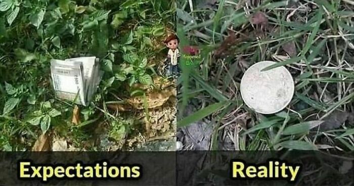 Funny memes Idealist Xavier showing contrast between expectations of finding money on road and reality with a small coin in the grass.